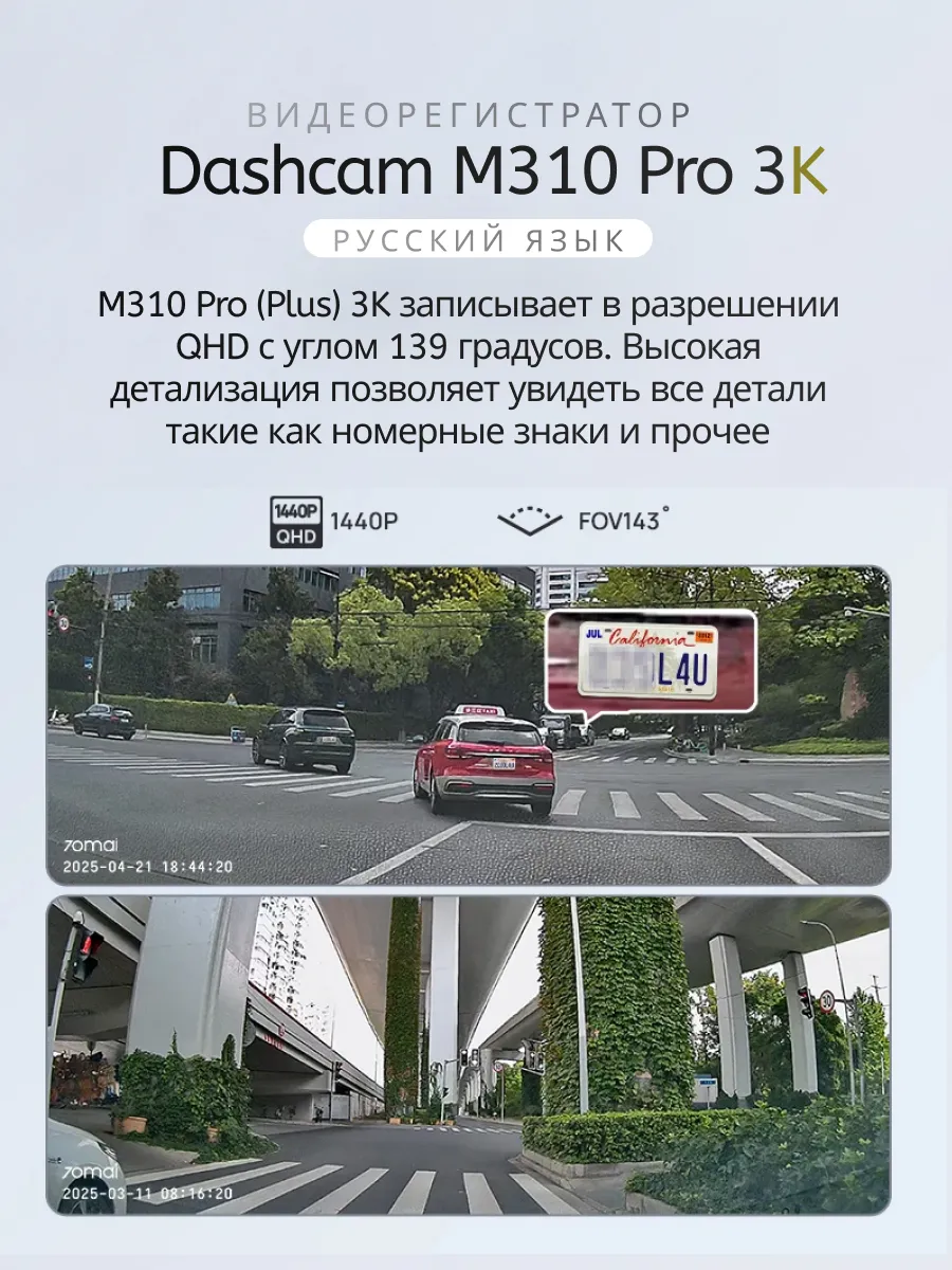Таймлапс 1 кадр в секунду 24/7 (доступен только при подключении спец. кабеля для парковочного режима «70mai hardware kit»)