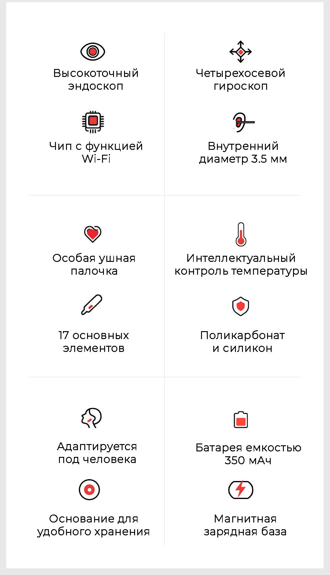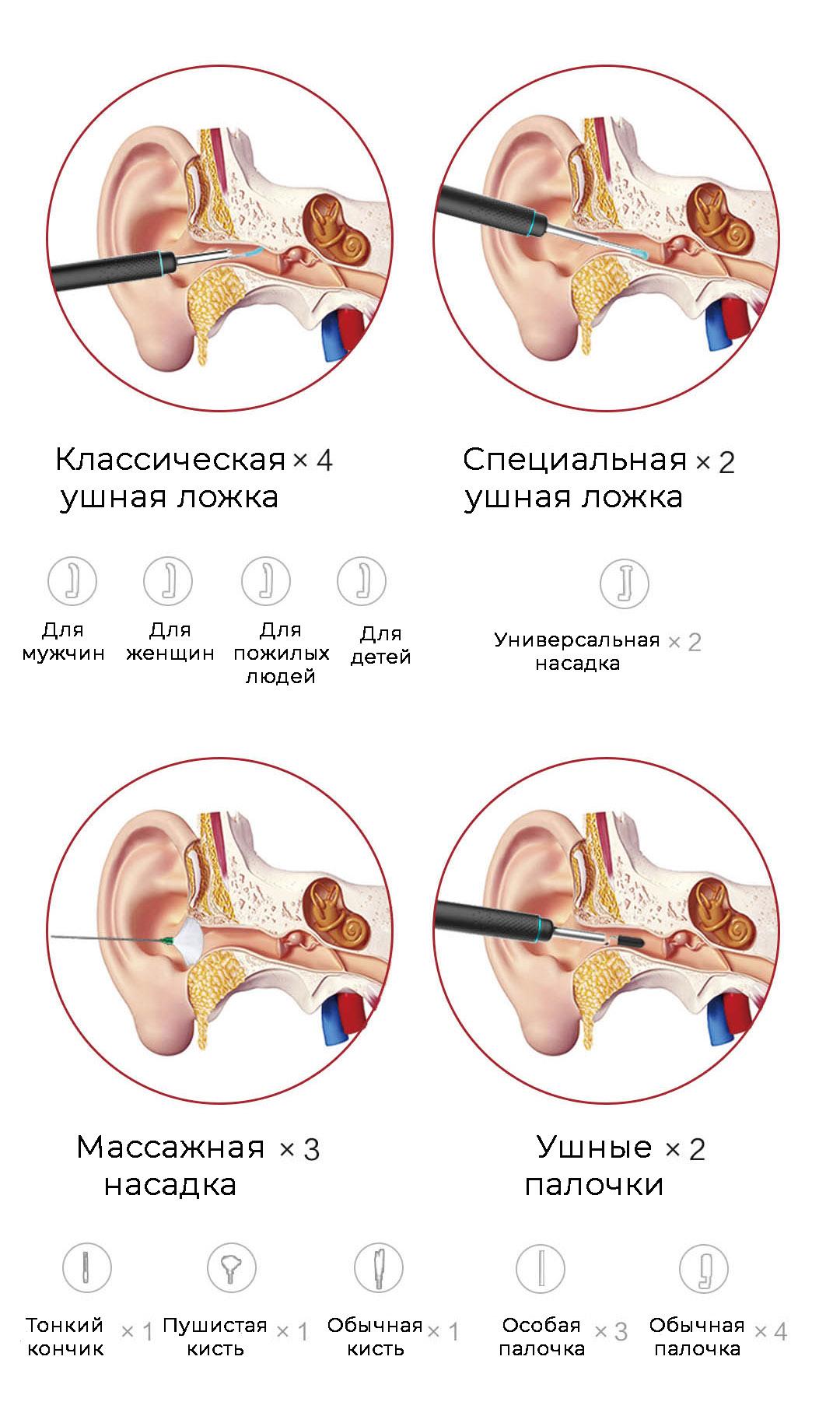 6 ложечек × 3 вида массажа × 8 видов воздействия. Мягкое воздействие от ушной раковины до барабанной перепонки.