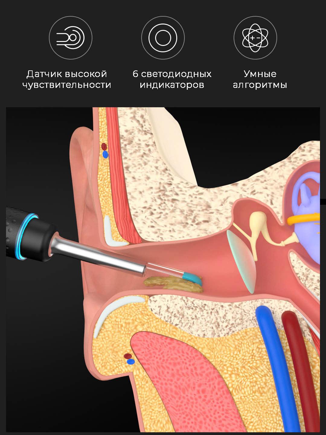 Качественная очистка и уход в любом положении и под любым углом. Без этой технологии возможен перекос и причинение боли ушам во время очистки.