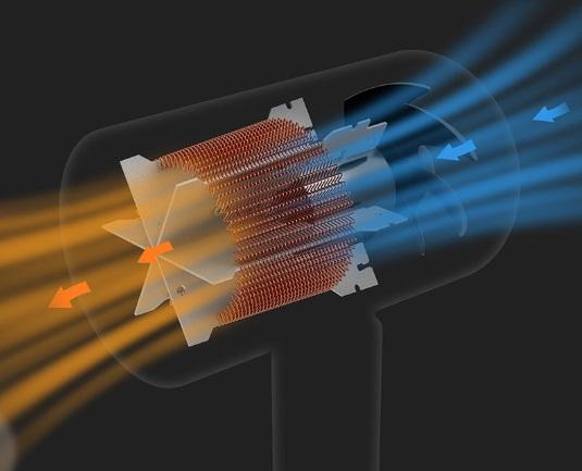 Конусное ступенчатое расположение нагревательных нитей позволяет повысить эффективность нагрева и выровнять передачу тепла, формируя выходящий поток однородной температуры. Быстрый обдув сушит волосы, при этом не перегревая и заботясь о них с использованием самого мягкого средства.