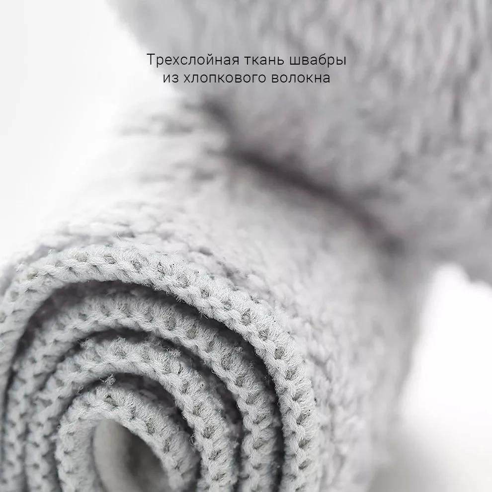 Ткань швабры состоит из 3-ех слоев: первый поглощает грязь, второй впитывает влагу, а третий выступает клеевой основой. Благодаря хлопковому волокну в составе ткани швабру легко промыть сразу после использования.