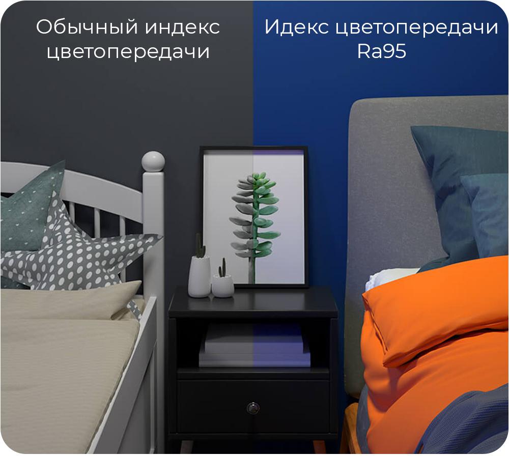 Высокий индекс цветопередачи Ra 95 означает, что в таком свете предметы выглядят почти как под естественным освещением. Будь то зеленые растения или разноцветные предметы интерьера - даже темным вечером они сохранят всю насыщенность и естественную красоту.