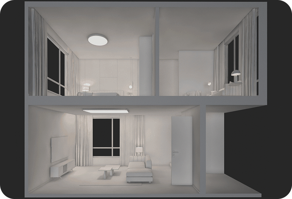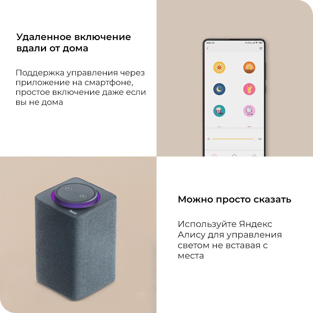 Самые частые функции светильника можно вынести на настенный выключатель, а с помощью пульта, голосового управления, приложения и диммера можно управлять режимами свечения, регулировать яркость и температуру. С помощью приложения на смартфоне можно даже вдали от дома управлять всеми умными устройствами. Еще до возвращения домой можно включить свет и другие устройства.