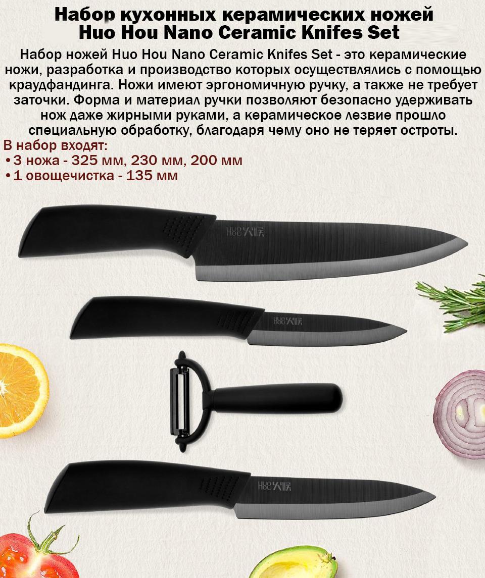Набор керамических ножей Huo Hou Nano Ceramic Knife Set 4 in 1 включает 4 предмета, изготовленных из современной циркониевой керамики с применением диоксида циркония путем прессования и обжига. Для изготовления ножей применяется инновационная японская технология вертикальной шлифовки, благодаря которой толщина лезвия не превышает 0.4 мм. Рукоятки выполнены из пластика с эластичным противоскользящим покрытием, безопасного для человека и приятны на ощупь. Ножи очень острые, легко моются и не требуют особого ухода.