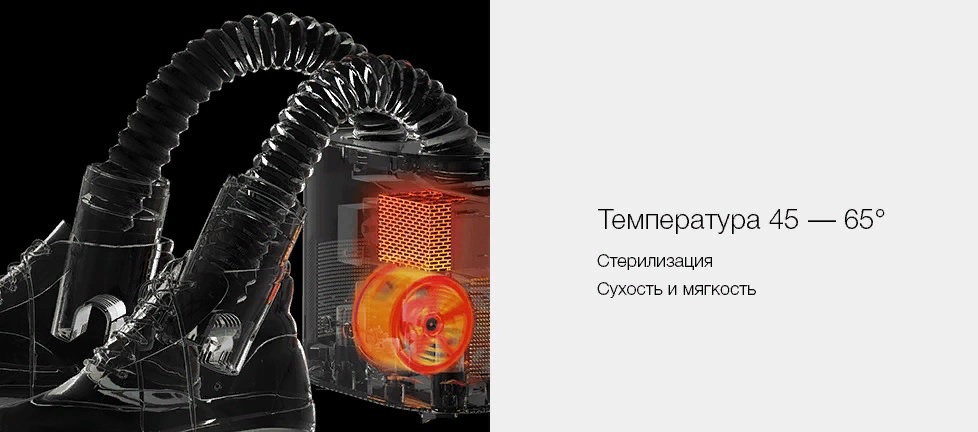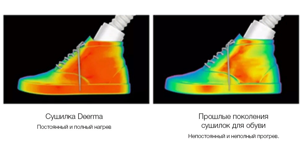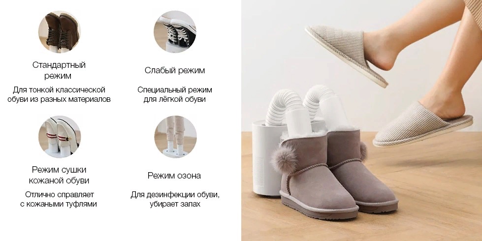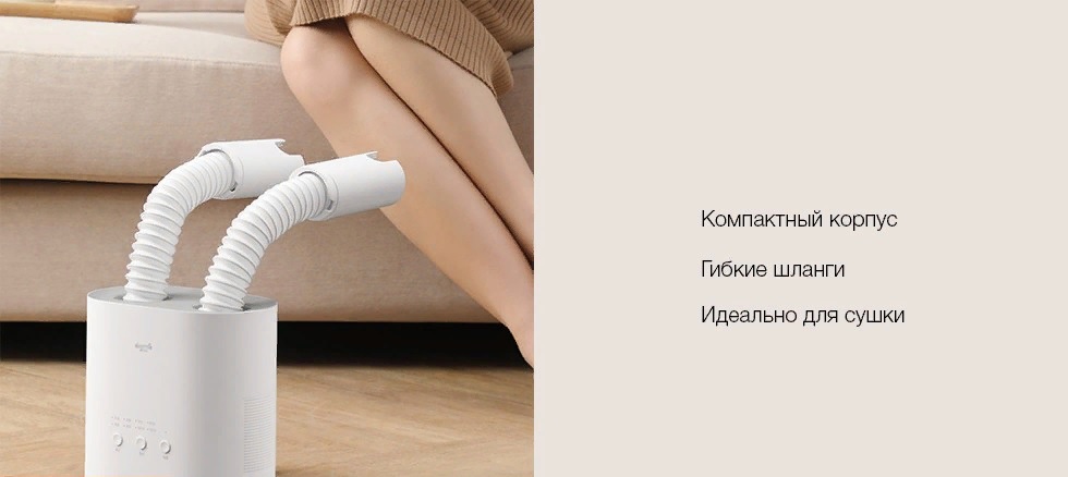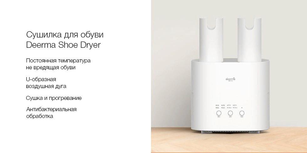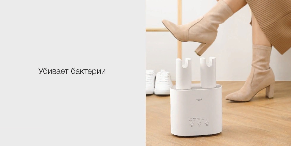 Сушилка для обуви Deerma Shoe Dryer - оригинальный и эффективный способ сушки и дезинфекции обуви. Забудьте о неприятном запахе и существовании грибка. Встроенный генератор окисляет и уничтожает среду обитания грибка. Сушилка активирует антибактериальный эффект, убирая сырость и оставляет обувь сухой и мягкой. Шланги, которые подают воздух имеют свойство растягиваться до 27 см и благодаря этому вы можете высушить обувь любой высоты. Наличие 4 режимов сушки и 3 режимов нагрева в сочетании с потоком воздуха помогают сушить обувь со всех сторон. Можете не беспокоится о безопасности, потому что сушилка полностью контролирует температурный режим как внутри, так и снаружи, при слишком высокой мощности выключается.Специальный таймер автоматически отключит устройство после истечения времени.