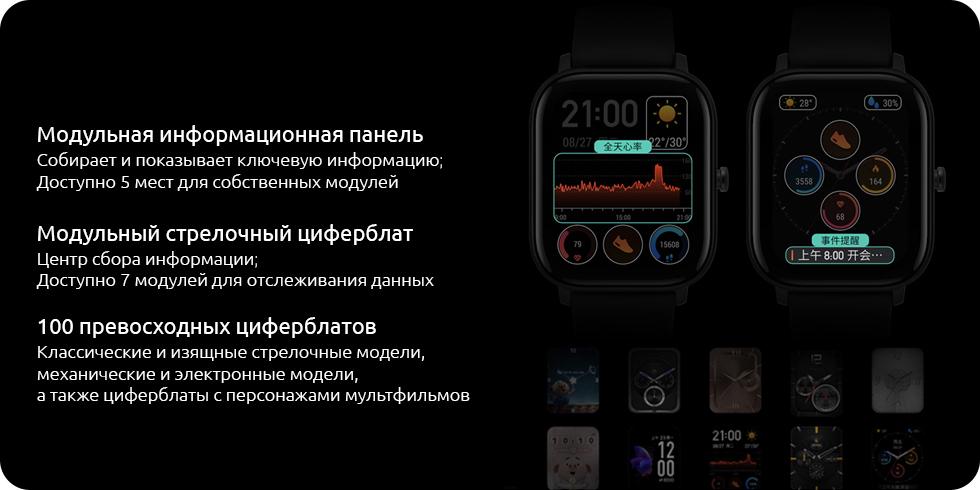 В отличие от круглых дисплеев многих умных часов, прямоугольный дисплей имеет большую площадь, и информации на нем помещается намного больше, что позволяет создать инновационный модульный циферблат, на котором можно разместить модули для отслеживания пульса, погоды, задач, календарь и любой другой важной информации. Теперь все необходимое поместится прямо на запястье. Кроме того, для Amazfit GTS можно выбрать циферблат из более чем 100 вариантов самых разных видов и фасонов.